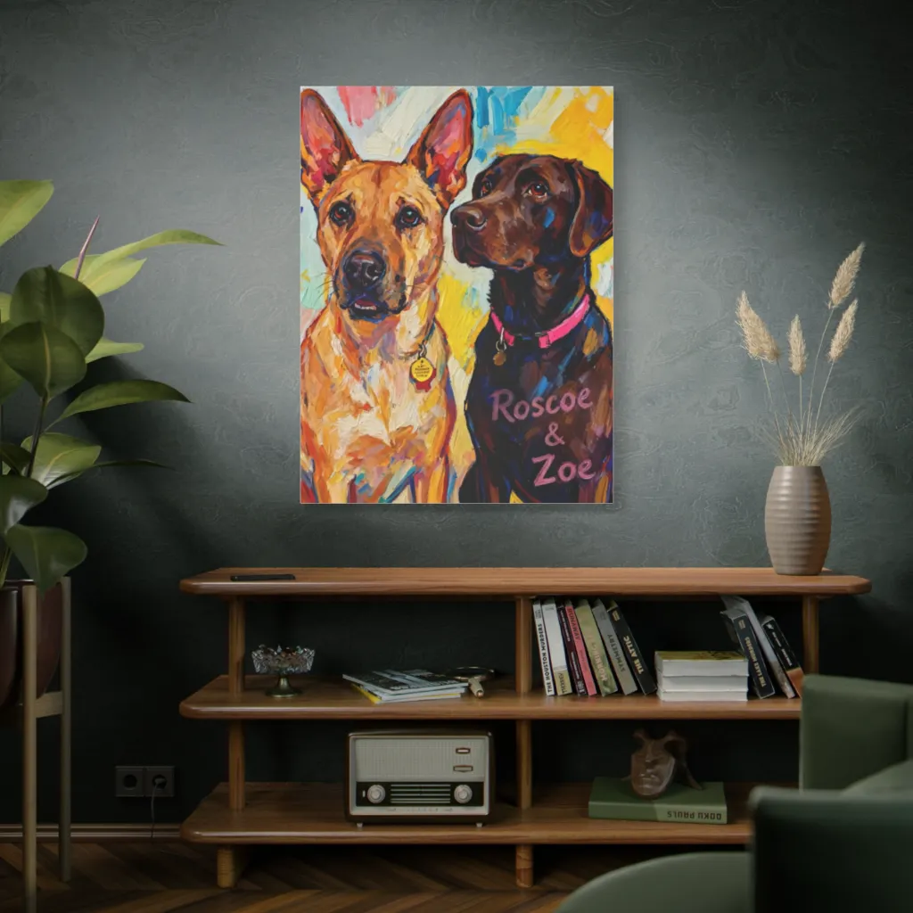 “Roscoe and Zoe, Companions” brings joyful vibrancy. Perfect above a raw oak console in a sun-drenched family room. Pair with brushed brass accents and soft linen for a chic, playful touch. Utterly charming!