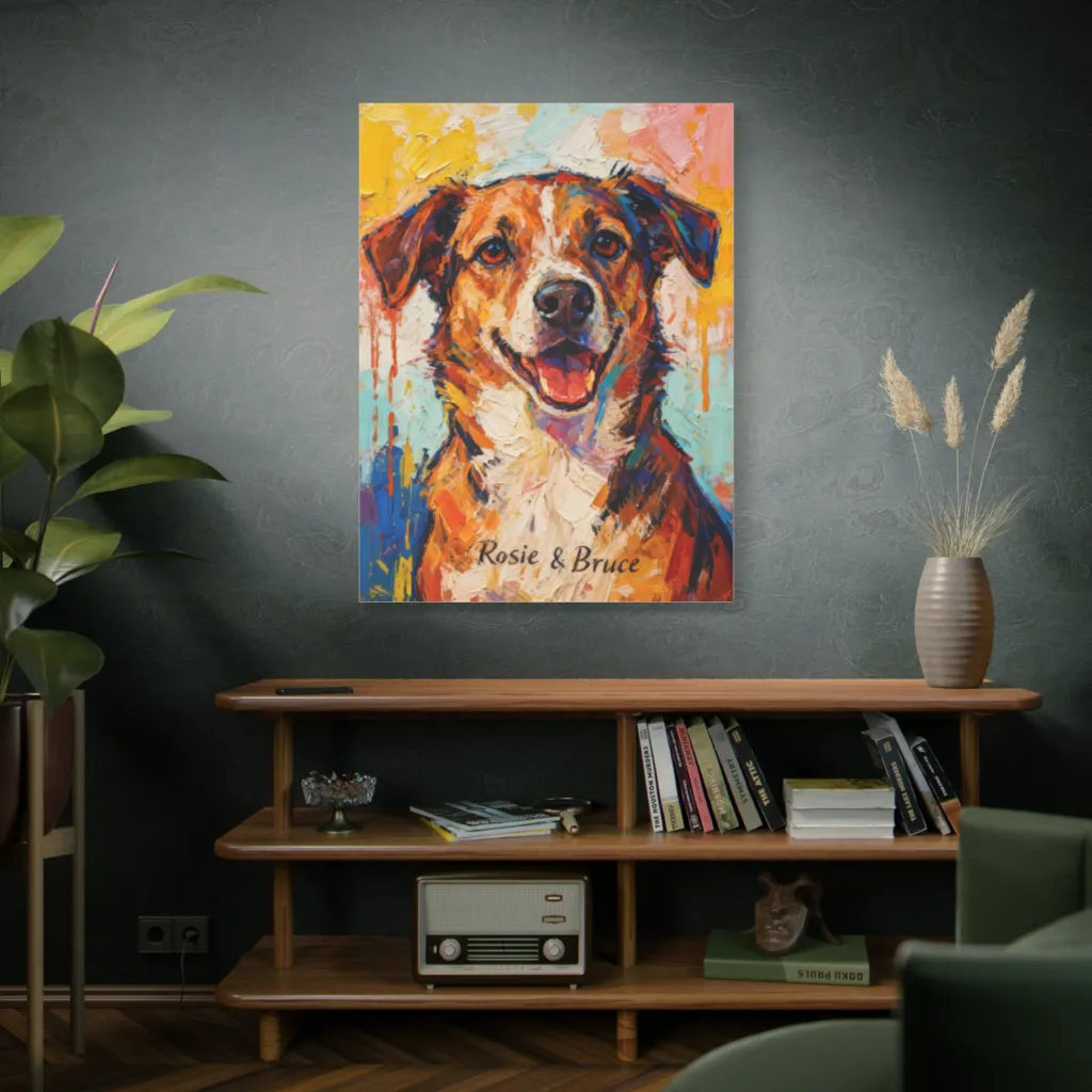 Rosie and Bruce, Golden Light commands the viewer with its vibrant impasto and dynamic composition. It possesses a Fauvist energy, perfect for a modern exhibition, capturing unbridled canine spirit with bold presence.
