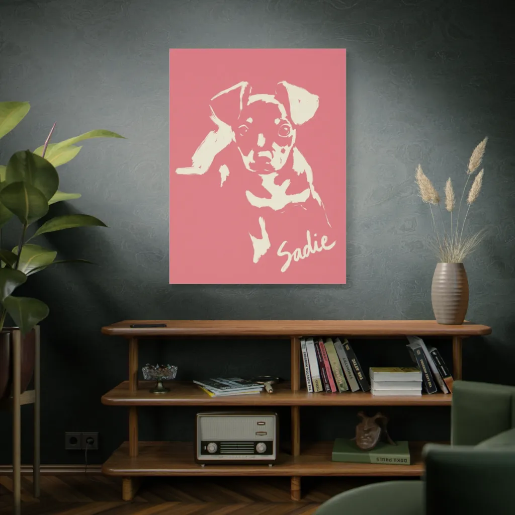 The Warhol-esque juxtaposition of Sadie's innocent gaze with avant-garde pink tonal harmony creates a visceral, almost shocking, commentary on canine celebrity. A truly evocative piece; profound.