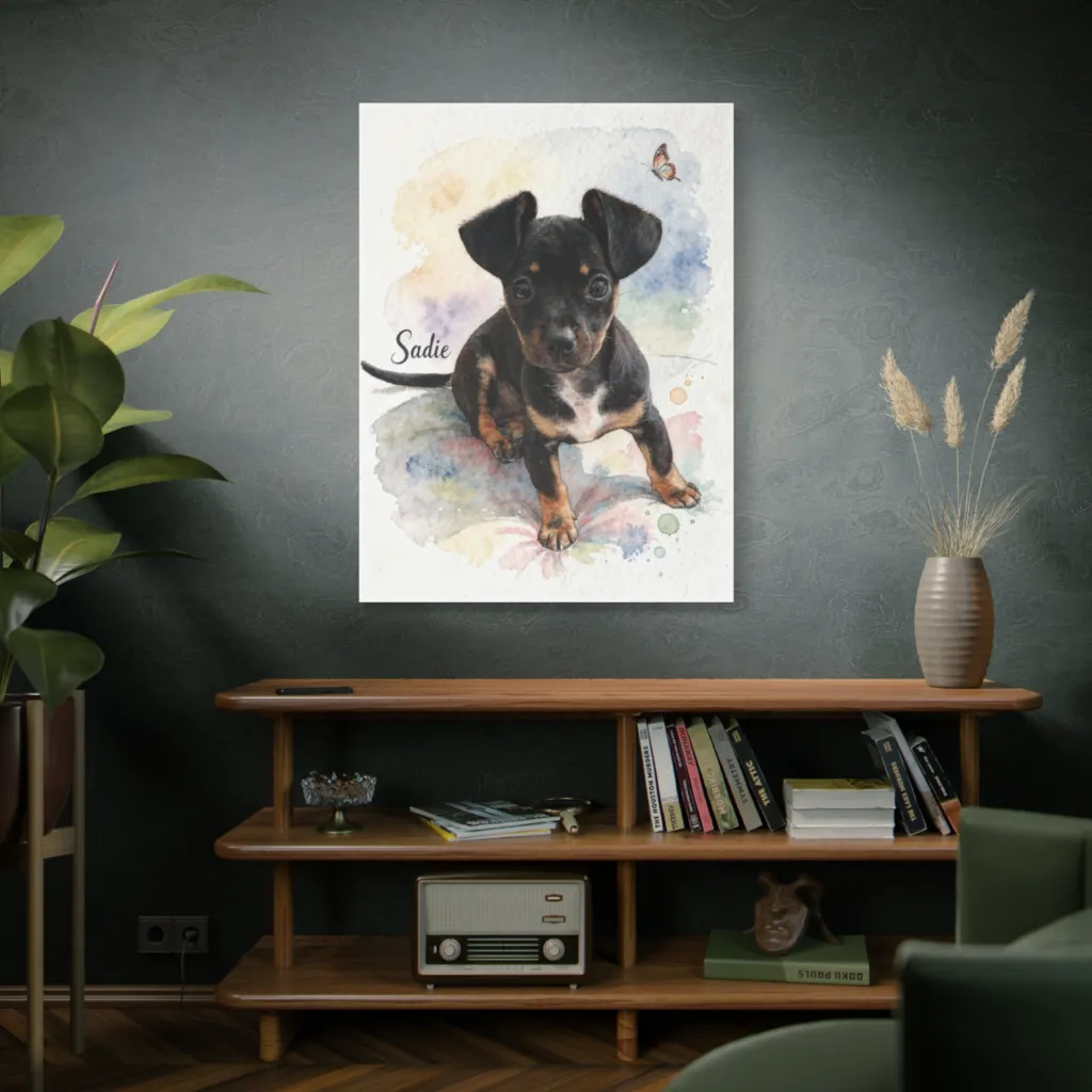 This piece masterfully blends traditional watercolor charm with a contemporary digital sensibility. Sadie's innocent gaze is a fresh, innovative take on pet portraiture, beautifully capturing fleeting joy.
