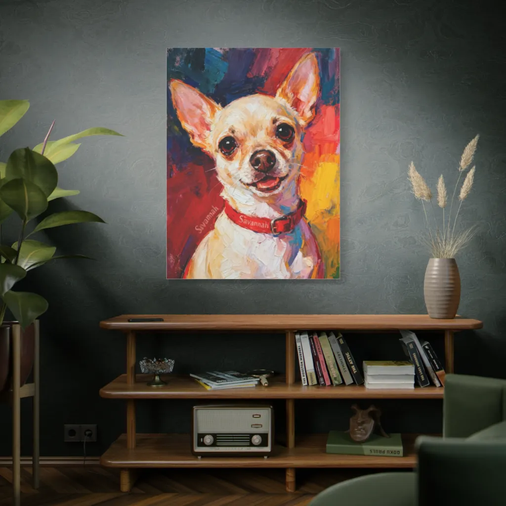 Vibrant impasto brushstrokes bring a delightful chihuahua to life, bursting with playful, endearing energy. Little Savannah's portrait bursts with as much zest as a sun-drenched day in her namesake city.