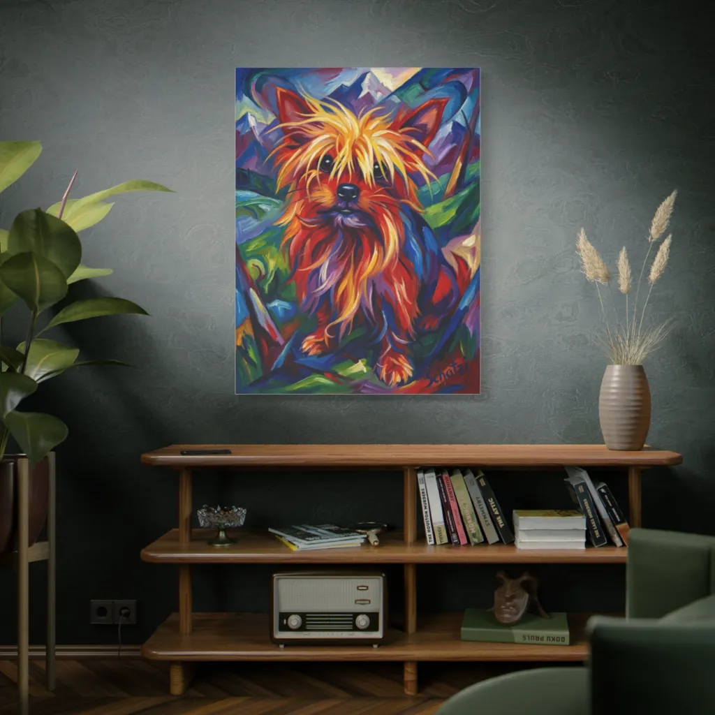"Schatzi, A Study in Hues" offers a visceral juxtaposition of fauve energy and alpine serenity. The audacious brushwork and vibrant tonal harmony create an evocative, almost avant-garde, canine presence. A masterpiece, truly.