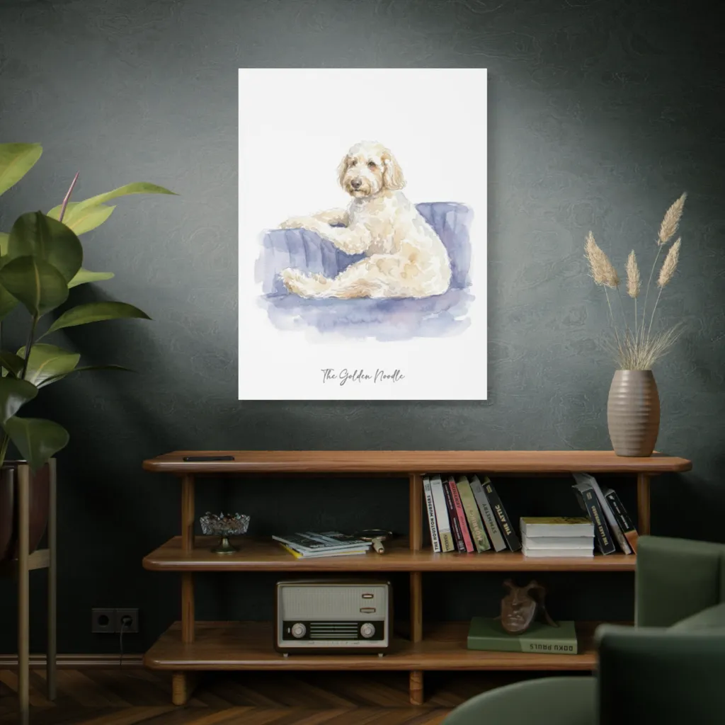 A charming watercolor captures a fluffy golden doodle lounging serenely on a blue cushion, exuding warmth and gentle comfort.