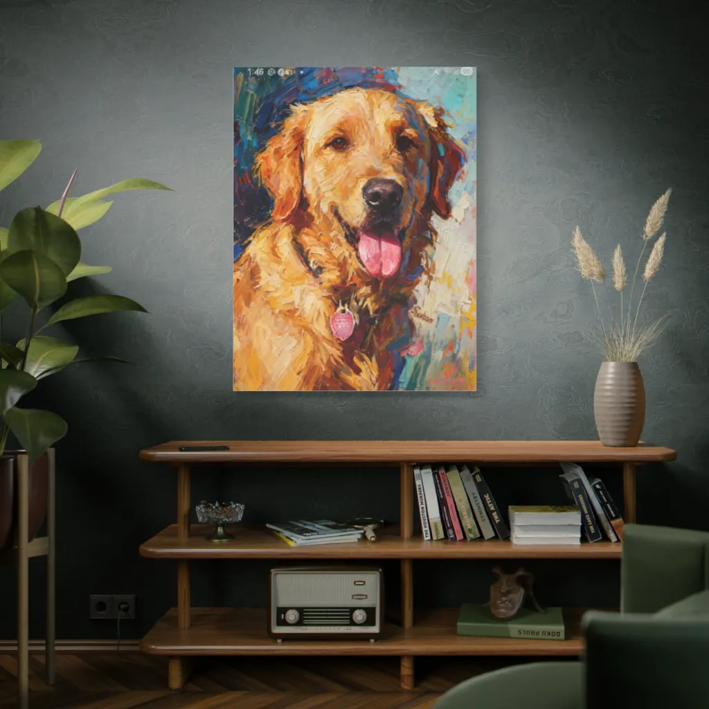 A sun-kissed Golden Retriever bursts forth in thick, joyous impasto, radiating unbridled canine glee. This vibrant Golden, with its impasto fur and playful tongue, looks ready to give Sochan the happiest, sloppiest greeting.