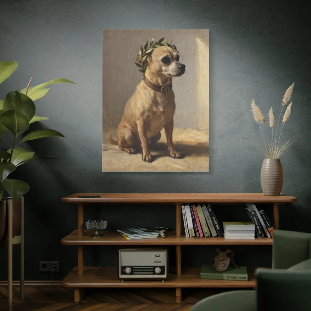 This charming, classic oil portrait depicts a small dog, crowned with laurel, exuding a surprisingly regal and calm air.