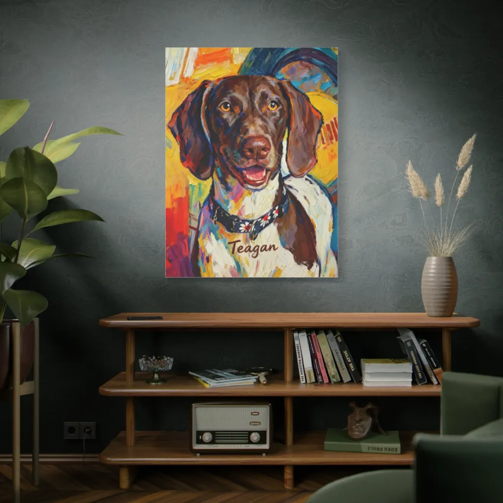 This piece innovatively blends traditional impasto warmth with digital vibrancy. Teagan's expressive, paint-splattered grin showcases a bold, contemporary technique, pushing pet portraiture into exciting new digital realms. Refreshing!