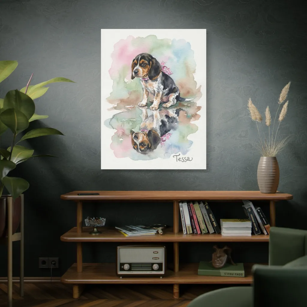 This whimsical watercolor perfectly captures a sweet beagle puppy's pensive reflection in a splash of pastel charm. Little Tessa, a dappled darling, ponders her perfect reflection, utterly charming in pastel.