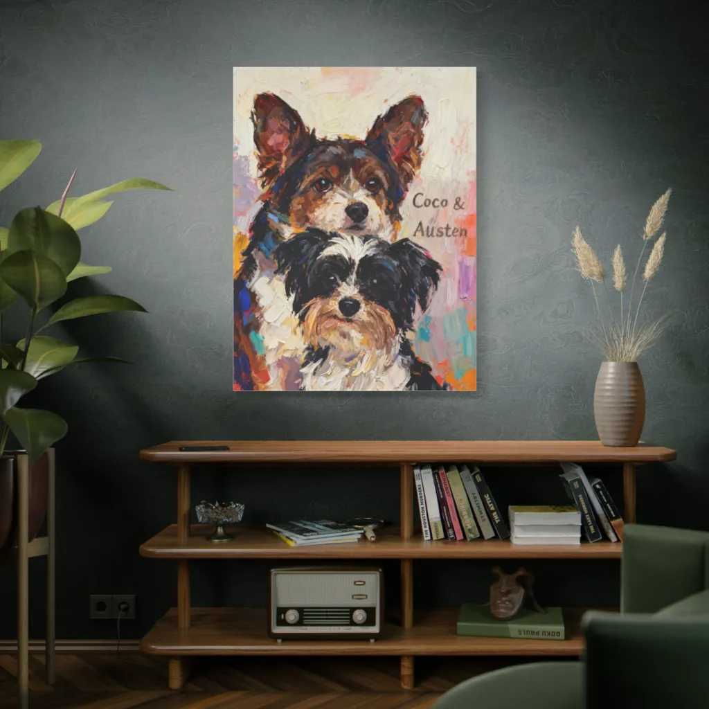 This impasto portrait uses bold, joyful strokes to capture two endearing dogs, exuding a warm and playful spirit. Coco, a fluffy companion, peeks playfully over Austen, proving their bond is as charmingly intertwined as Jane's plots.