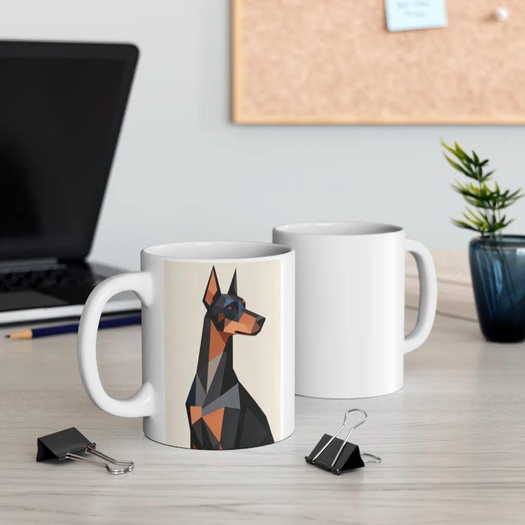 A stark, geometric Doberman portrait, sharply rendered, projects an alert, modern elegance with its sleek lines and stoic mood. Even Gary, a connoisseur of cubist canines, agrees this geometric Doberman is quite the sharp dresser.