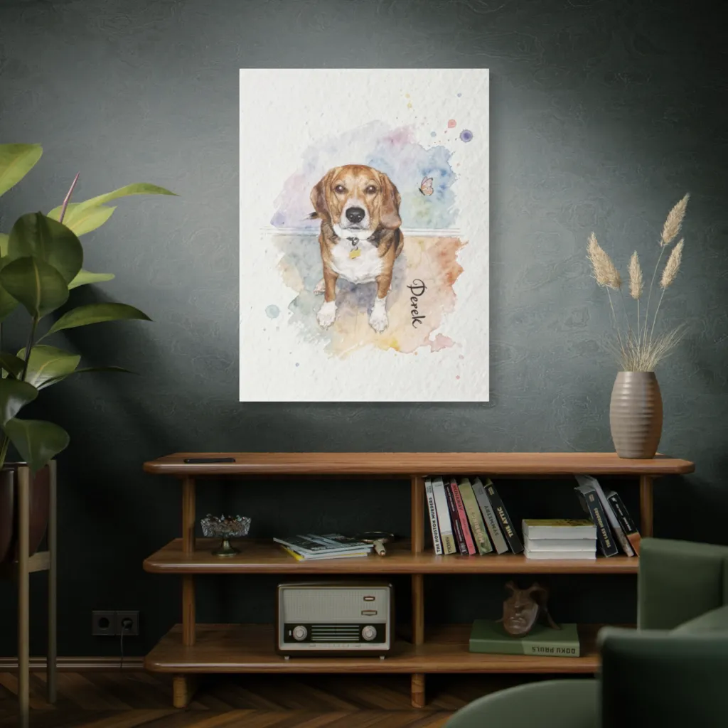 "The Contemplative Derek" brilliantly merges traditional watercolor's charm with a digital-age vivacity. Its experimental use of vibrant washes redefines pet portraiture, pushing boundaries. Boldly innovative and captivating!