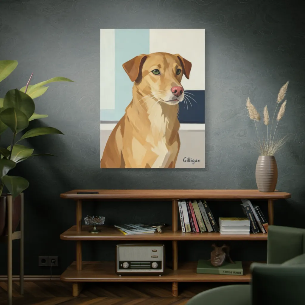 Gilligan's soulful gaze evokes a serene yet playful contemplation, inspiring daily moments of thoughtful calm and gentle humor. This bold piece brings comforting companionship and quiet joy into your home.