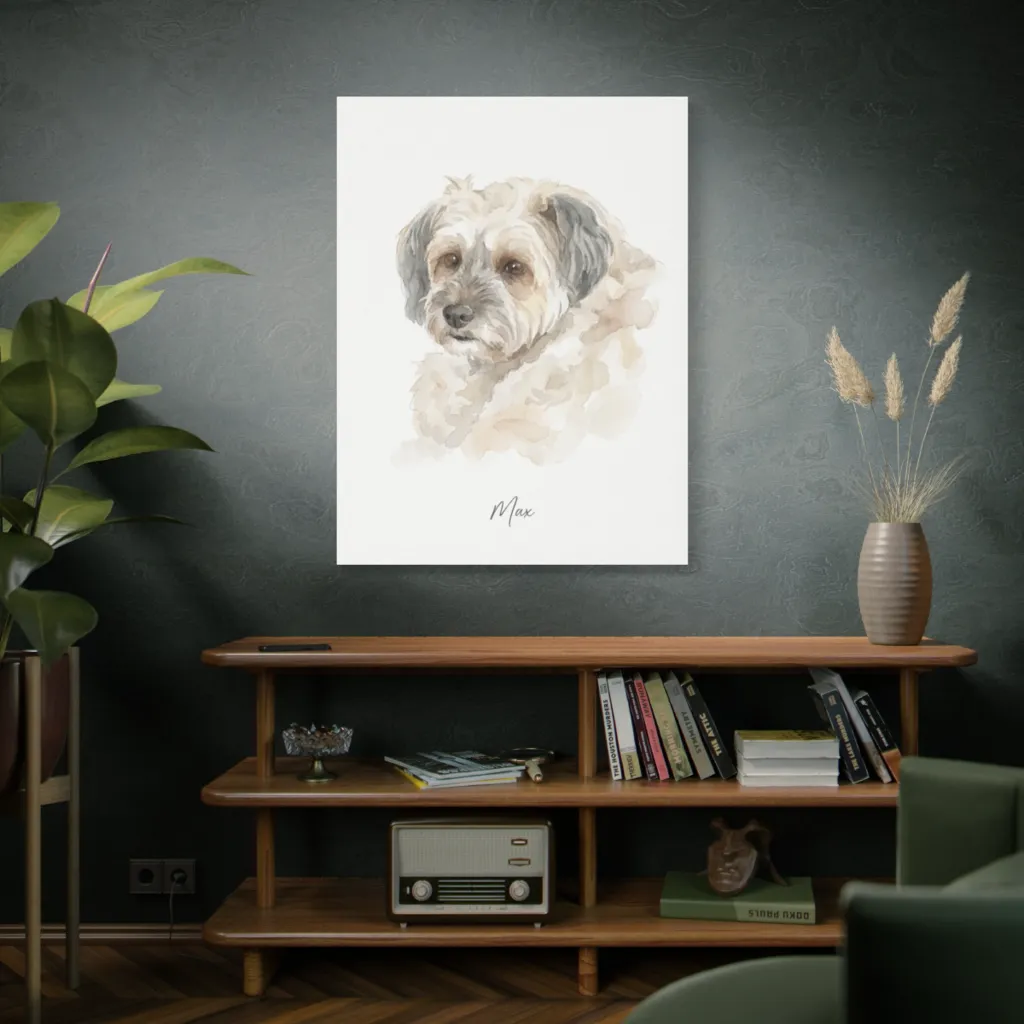 This piece cleverly merges classic watercolor with a contemporary digital sensibility. The soft washes feel fresh, transforming traditional pet portraiture into a vibrant, innovative, and deeply engaging modern art experience. Boldly unique!