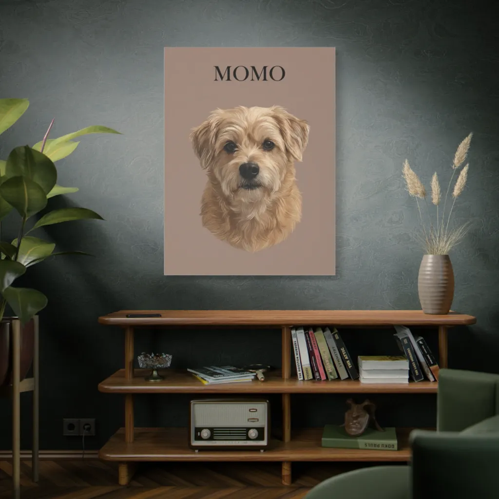 “The Contemplative Momo” shines. Place it above a minimalist raw oak console with brushed brass accents in a serene living space. Its charm elevates any contemporary interior with understated elegance.