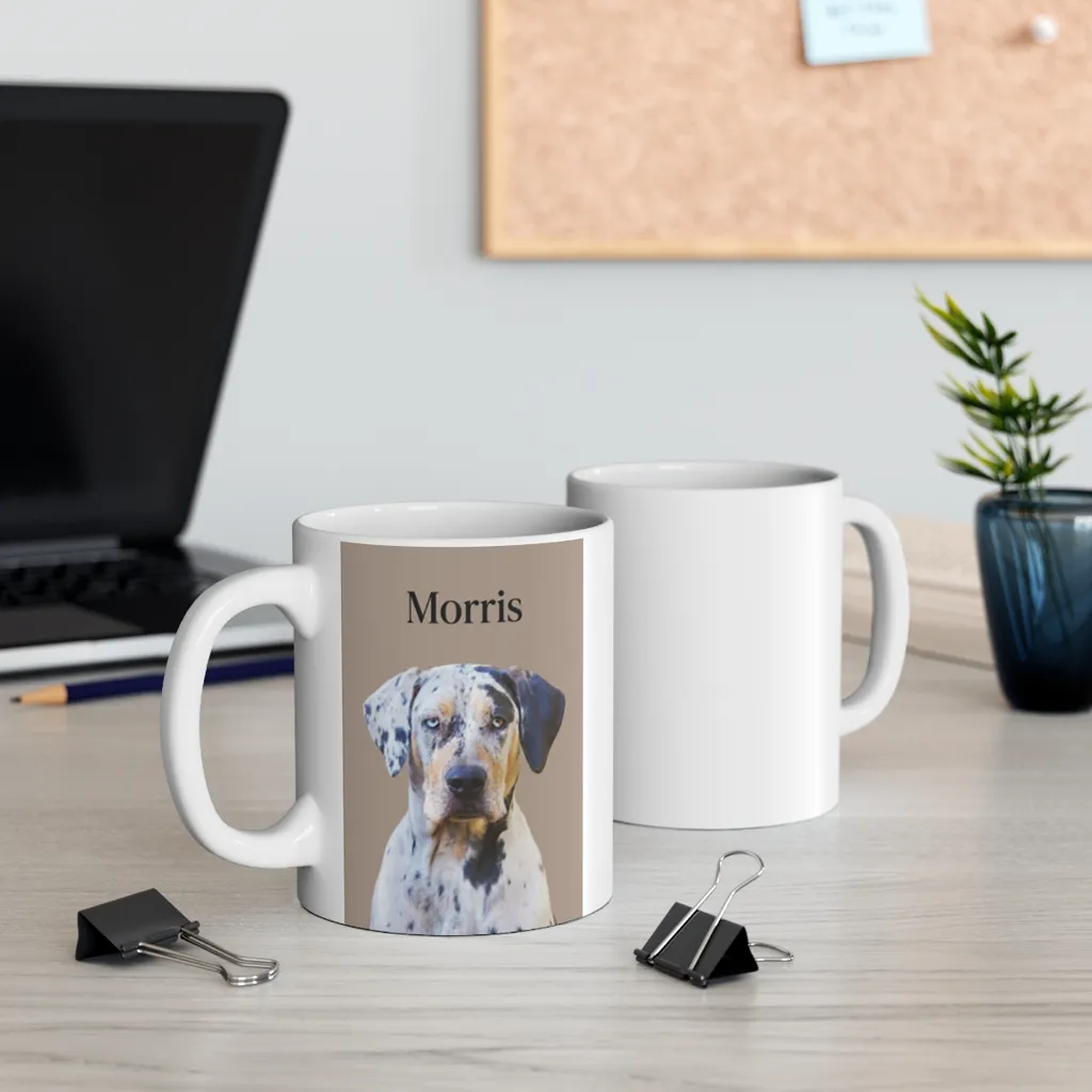 A charming, high-definition pet portrait captures Morris, a striking merle dog with soulful heterochromatic eyes, exuding calm curiosity.