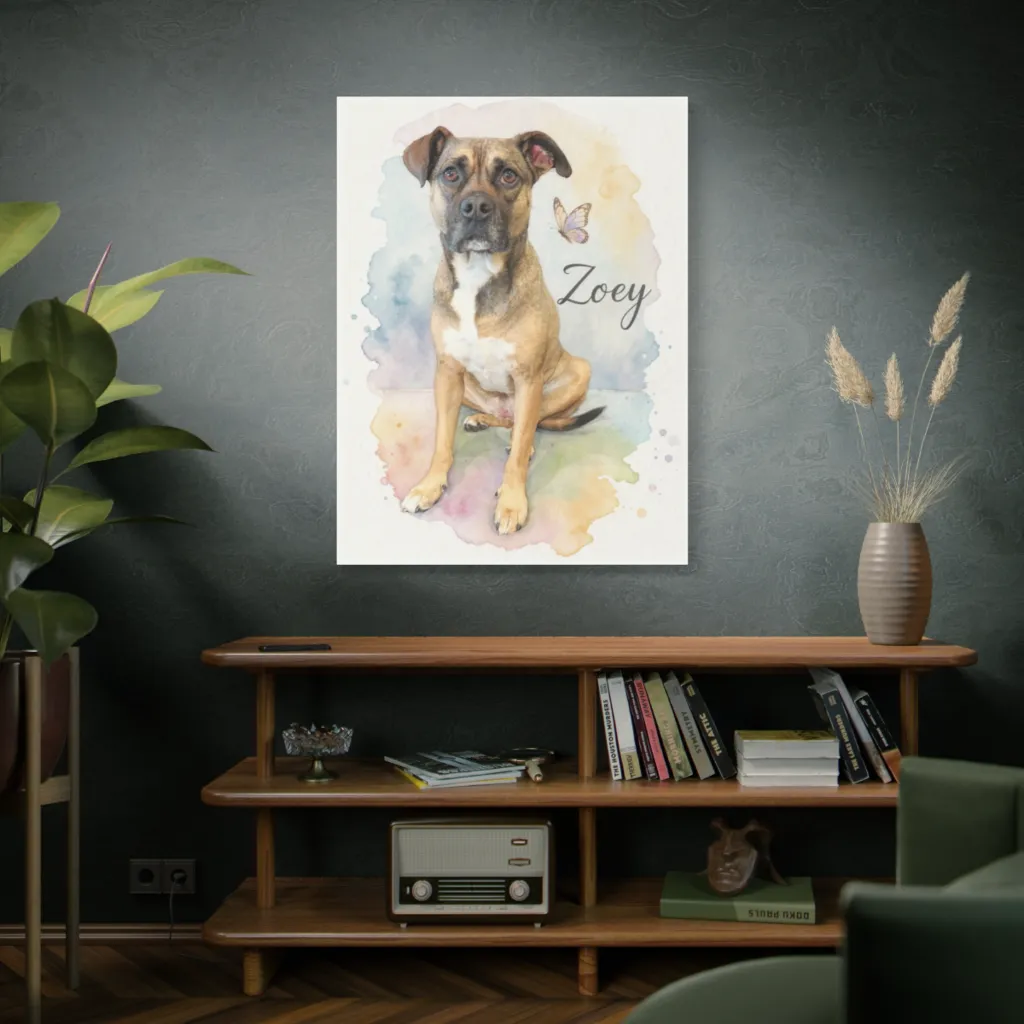 Zoey, a soulful pup, perfectly anchors this whimsical watercolor, her serene gaze framed by soft washes and a playful butterfly, radiating gentle charm.
