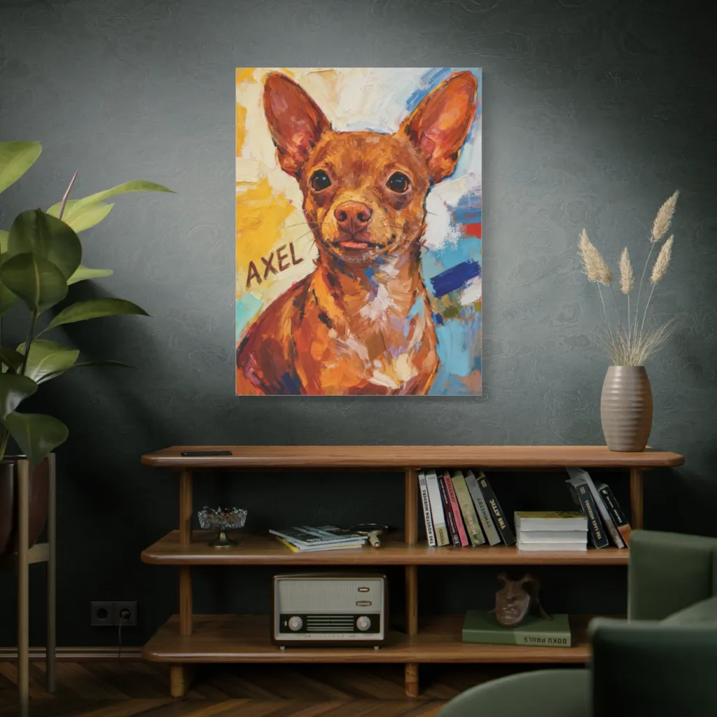 Vibrant impasto strokes depict a charming, wide-eyed chihuahua with a playful tongue, radiating an endearing and lively mood. Axel's vibrant impasto portrait perfectly captures his big-eared charm and mischievous little tongue.