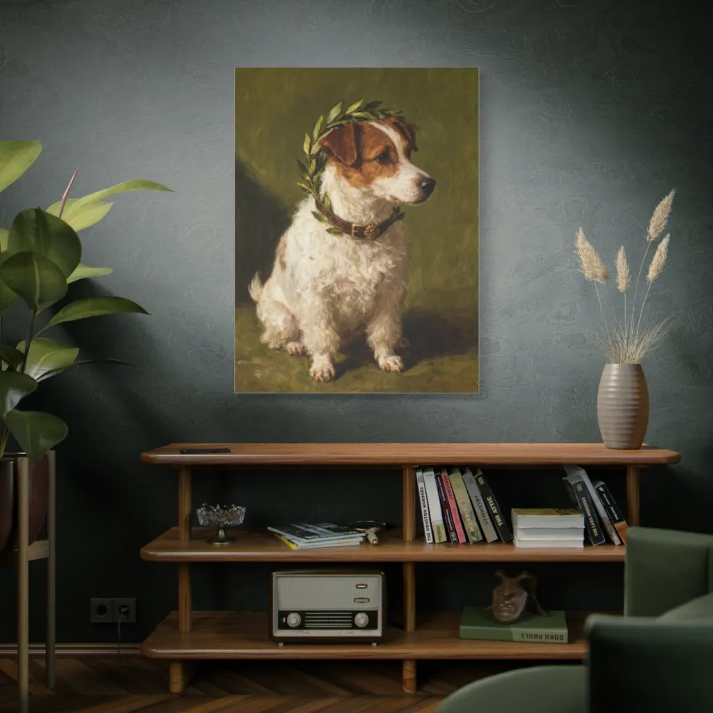 Classical brushwork elevates a laureate terrier to regal status, blending noble dignity with playful charm.