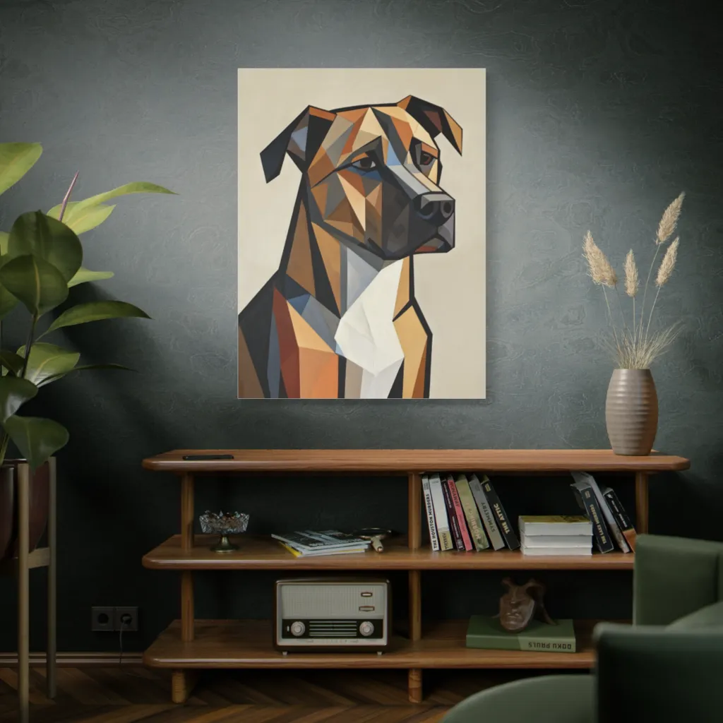 "The Pensive Warren" brilliantly fuses traditional portraiture with an angular, almost algorithmic aesthetic. The faceted composition creates a strikingly modern and soulful presence. It's an innovative, digitally-charged reinterpretation of the classic pet portrait. Truly experimental.