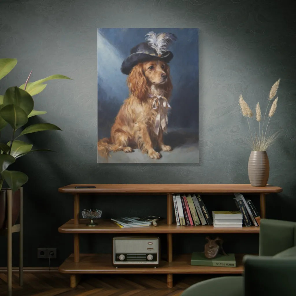 "The Plumed Gypsy" innovatively blends traditional portraiture with digital artistry. Gypsy's bold gaze and whimsical hat showcase a fresh, contemporary take on classic pet art. Truly captivating innovation!