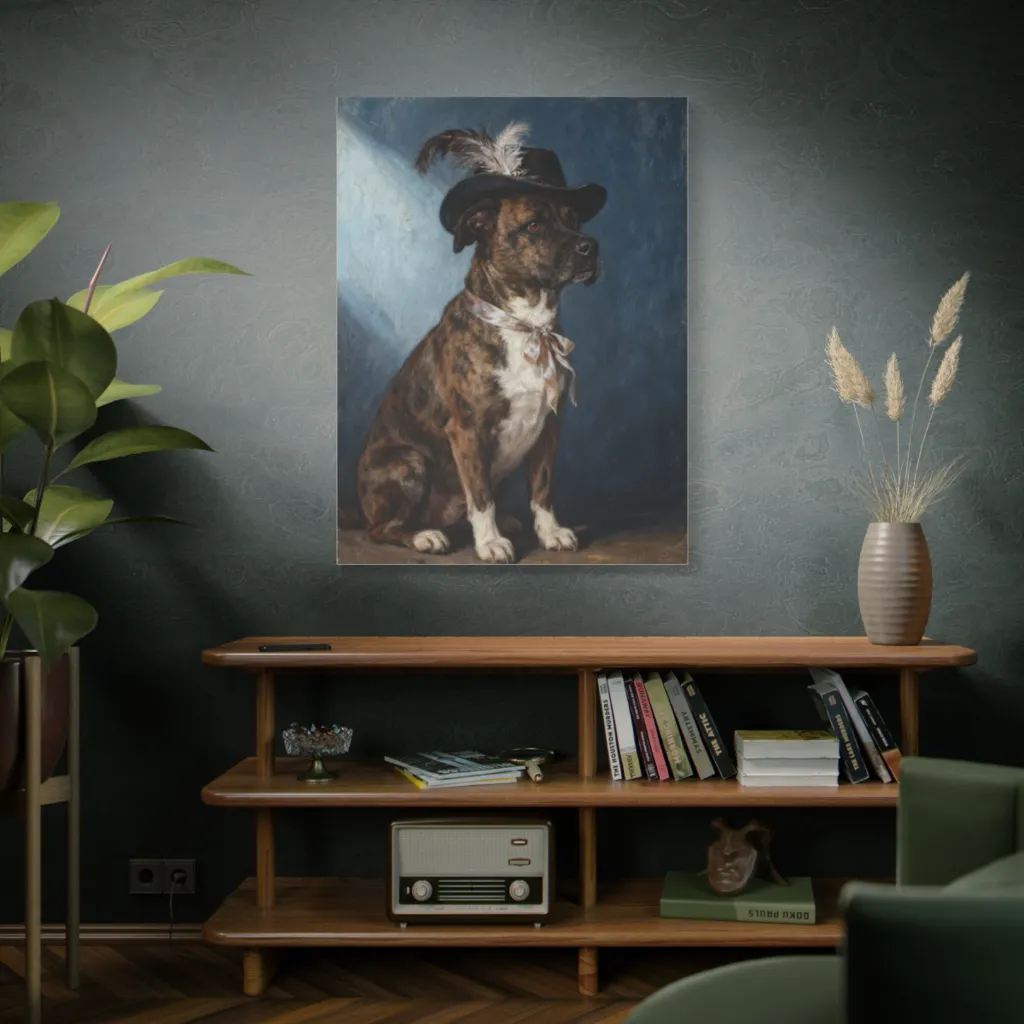 "The Plumed Warren" reveals a sublime juxtaposition: visceral canine gravitas meets feather-light folly. Its tonal harmony and evocative brushwork elevate this 'dogumentary' to avant-garde portraiture. A masterpiece, undoubtedly.
