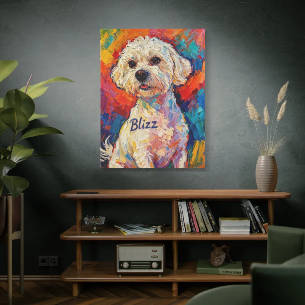The Radiant Blizz boldly fuses traditional portraiture with digital-era vibrancy. Its innovative impasto texture and kaleidoscope of color exemplify a cutting-edge approach, pushing pet art boundaries. A truly experimental and modern masterpiece.