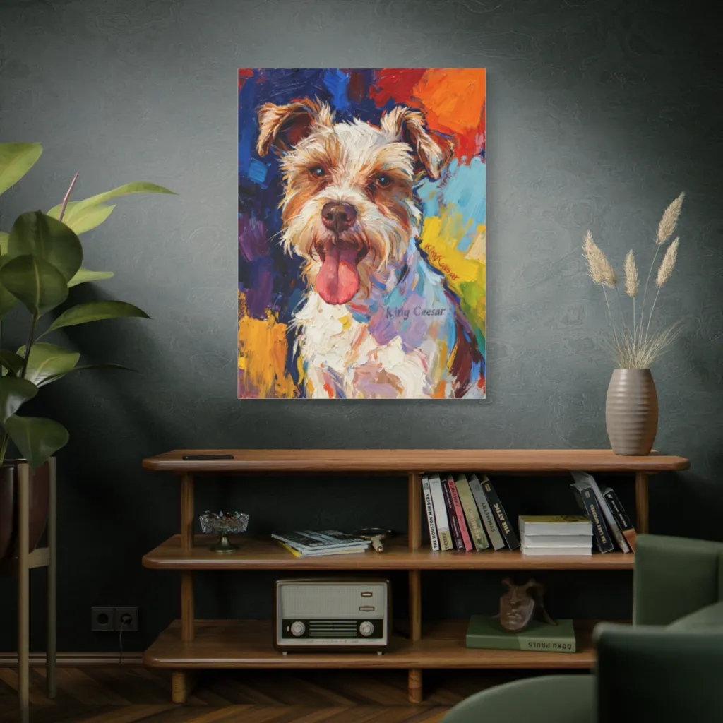 King Caesar, with his vibrant impasto fur and joyful, tongue-out grin, proves even royalty can be a slobbery good boy.