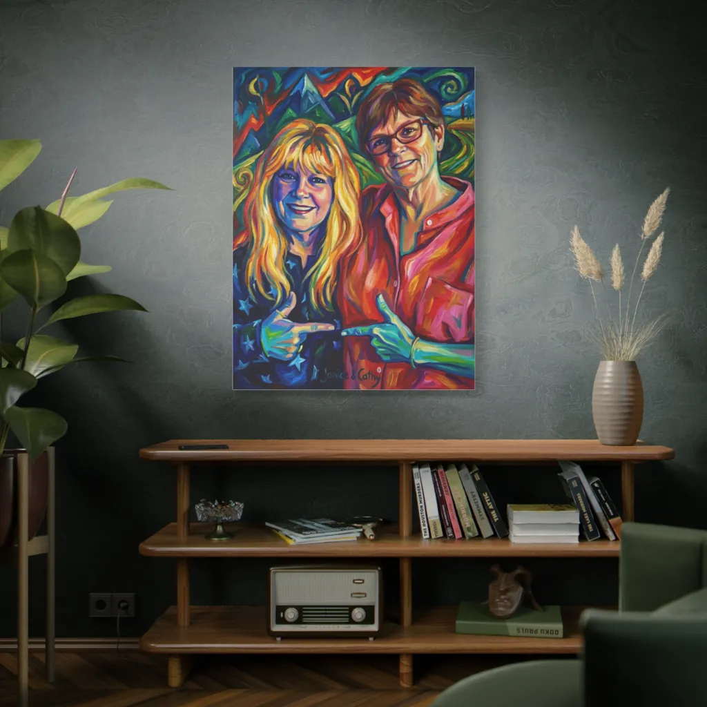 Two radiant women in a vibrant, expressive portrait beam with joyful camaraderie amidst a swirling, colorful landscape. Janice and Cathy are playfully caught in a colorful moment, each pointing to the other as the obvious muse.