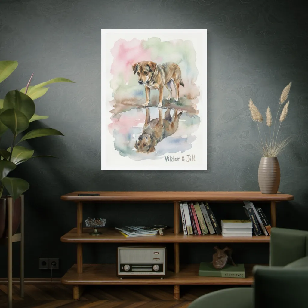 This digital watercolor brilliantly merges traditional portraiture with modern introspection. The puddle's reflective effect, likely an algorithmic rendering, offers a fresh, innovative take on pet art's contemporary narrative. Superb!