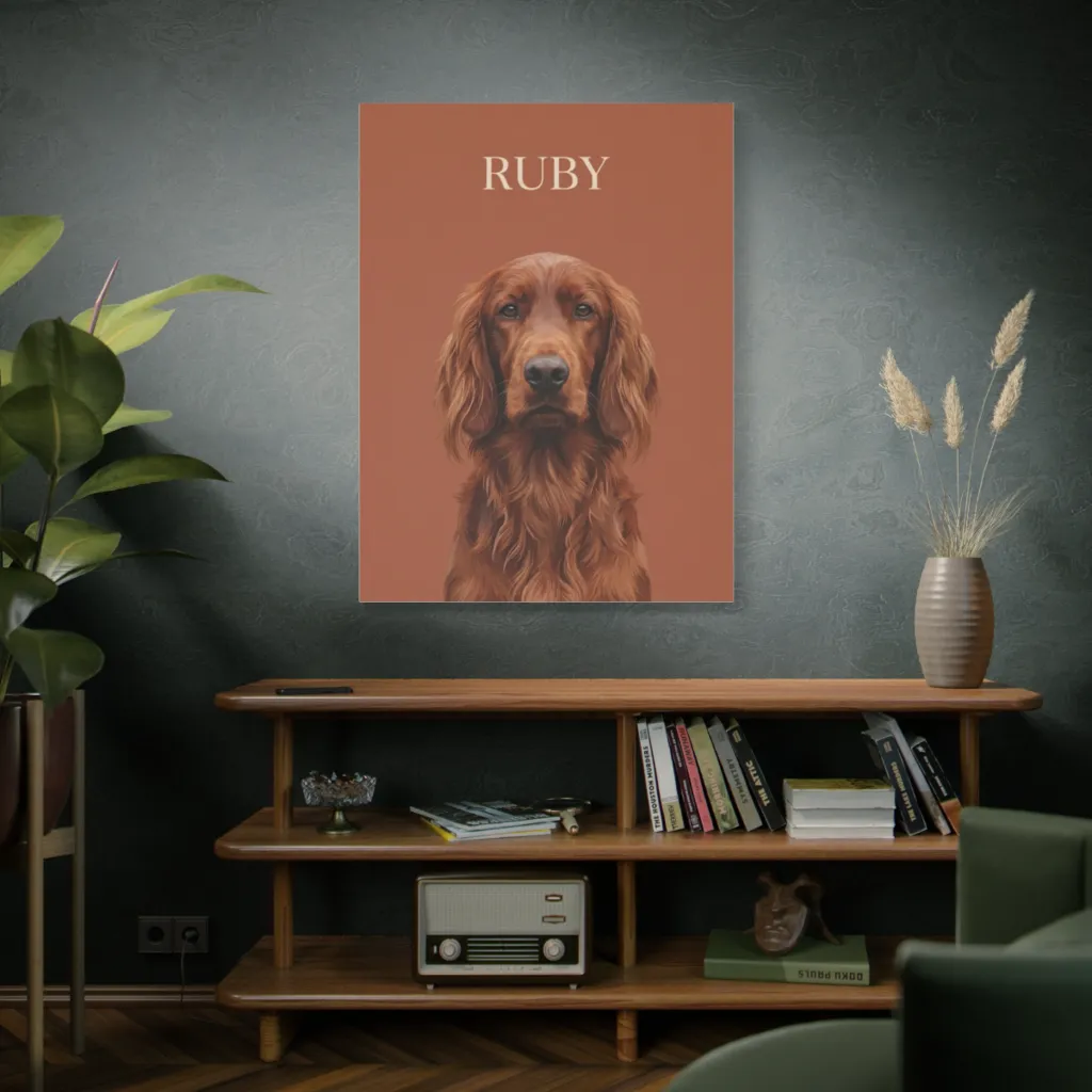 A crisp digital portrait of Ruby, a regal Irish Setter, captures her soulful gaze against a warm, minimalist backdrop, exuding calm dignity. Ruby's earnest gaze suggests she's patiently waiting for her next walk or a very important biscuit.