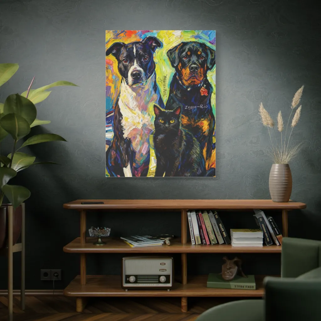 Negan, Zeus, and Rio, a magnificent, furry triumvirate, guard their painterly kingdom with playful, watchful eyes.
