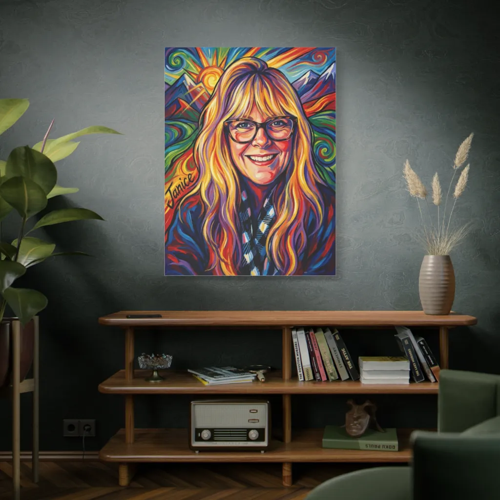 “The Sunlit Janice” explodes with chromatic harmony! Its high-saturation technicolor palette, balanced with warm-cool contrasts, brilliantly captures Janice's radiant, optimistic energy. A masterful study in joyful color resonance.