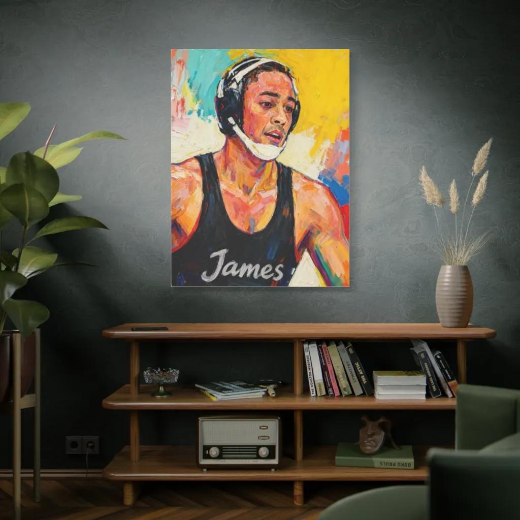 “The Vigilant James” demands attention. Its vibrant impasto feels electric. Pair above a sleek raw oak console, flanked by brushed brass sconces, in a minimalist, sun-drenched foyer. Utterly captivating and chic!