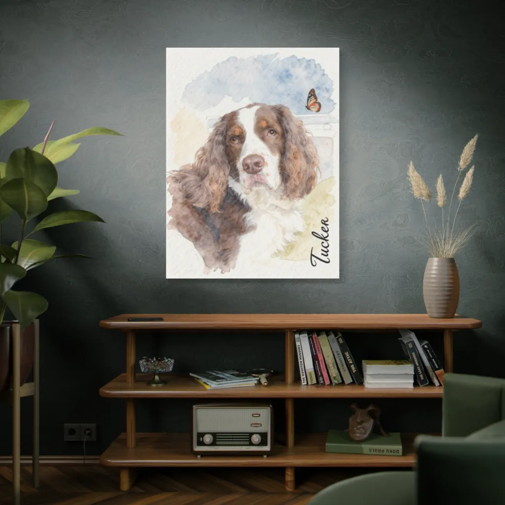 This soft watercolor captures a curious spaniel's soulful gaze, its gentle charm underscored by a whimsical butterfly. Tucker, master of the "puppy eyes," is utterly unbothered by that flitting butterfly.