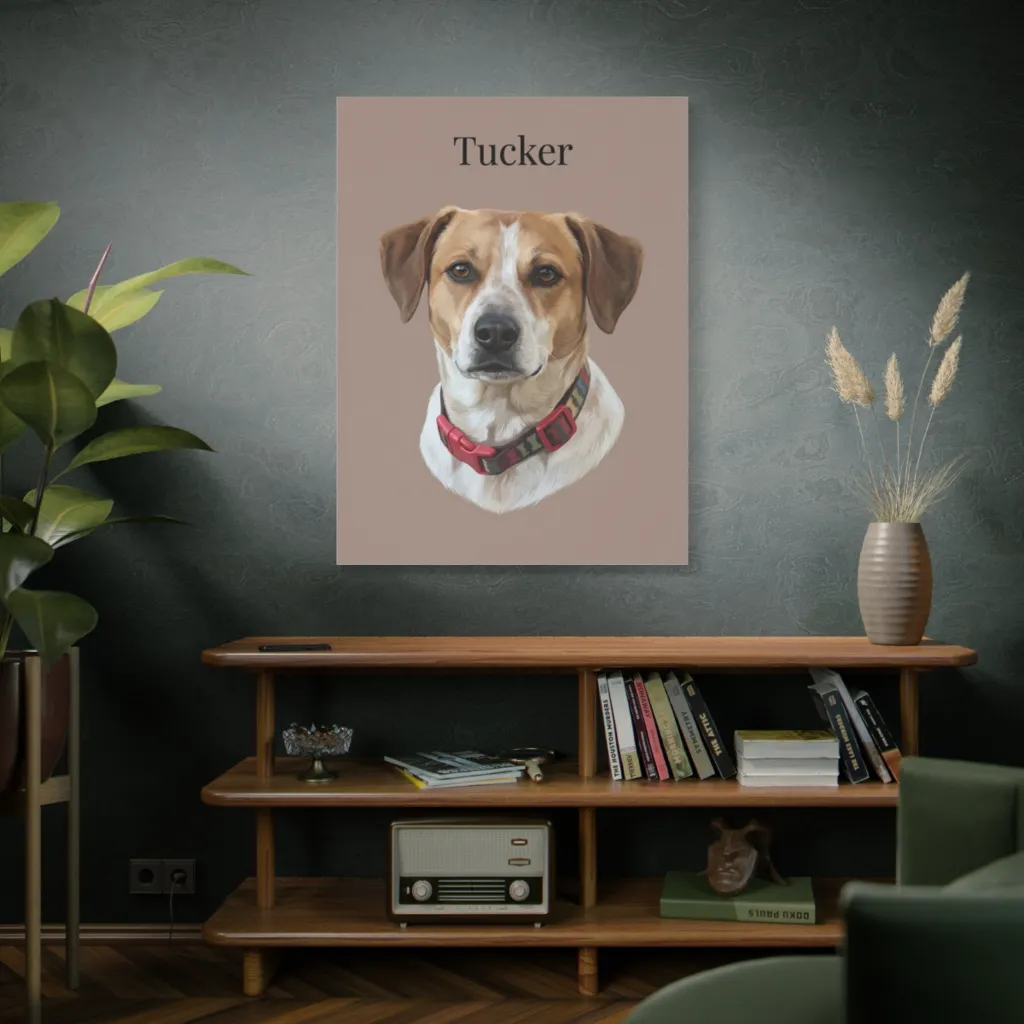 This crisp digital portrait beautifully renders a canine subject's soulful gaze, evoking a mood of endearing loyalty. Tucker's portrait proves he's a true masterpiece, perhaps contemplating his next treat.