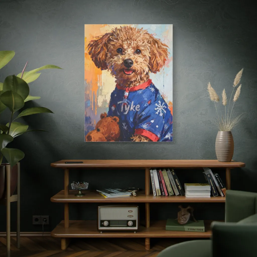 The impasto, a visceral juxtaposition of canine innocence and festive blue, achieves a tonal harmony almost... daring. Tyke's avant-garde presence transcends mere portraiture; truly a piece for the ages.