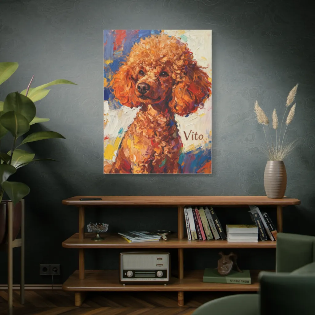 Vito's vibrant impasto truly captures his charming, playful spirit. His bright expression and poised stance reveal a dog full of life, ready for his next masterpiece. A delightful portrayal of a joyful soul.