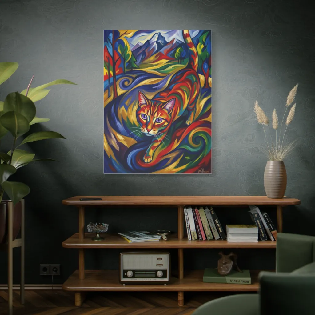 This vibrant, swirling cubist landscape features a prismatic cat, exuding an energetic and whimsical mood.