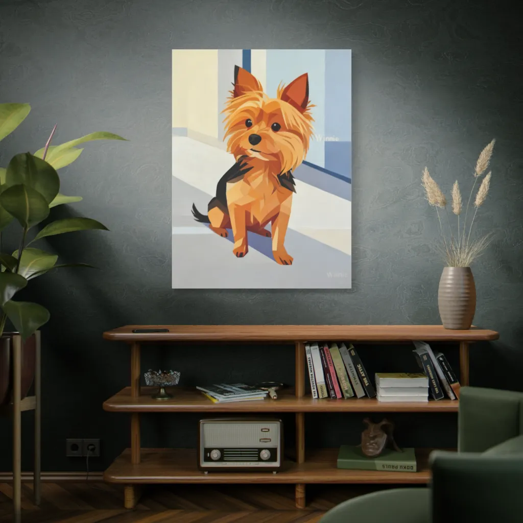This geometric genius renders a vibrant terrier, all sharp angles and fluffy spirit, gazing with delightful, modern charm.