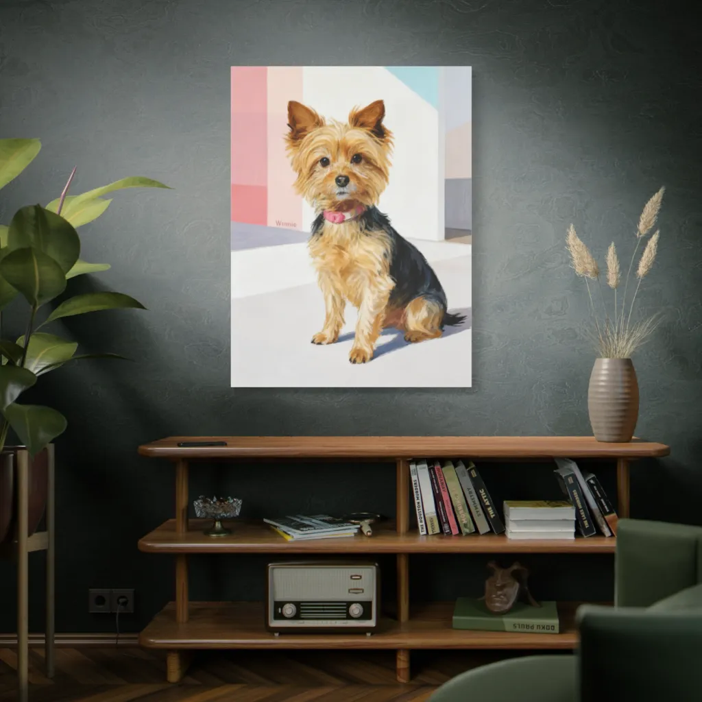 This charming, bright portrait captures an adorable Yorkie with painterly finesse against a modern, color-blocked backdrop, radiating pure canine charisma.