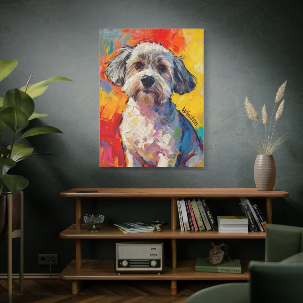 Vibrant impasto brushstrokes create a charming, expressive dog portrait bursting with joyful energy. Winston, a fluffy impasto icon, looks ready to leap from his vibrant portrait for a well-deserved treat.