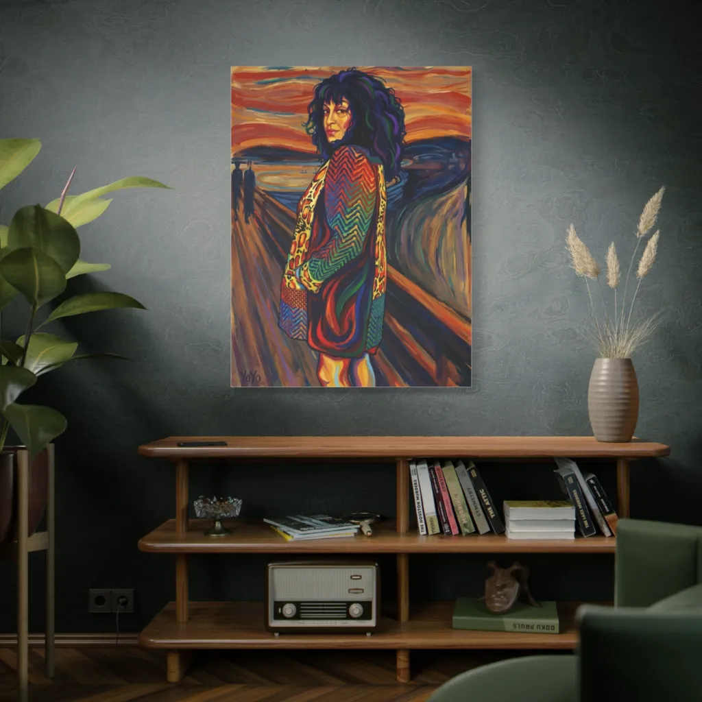 Vibrantly expressive, a confident woman in a kaleidoscopic jacket defiantly owns Munch's swirling, anxious landscape with playful panache. YoYo joyfully yanks *The Scream* into a vibrant, stylish present, proving that even existential dread can rock a killer coat.