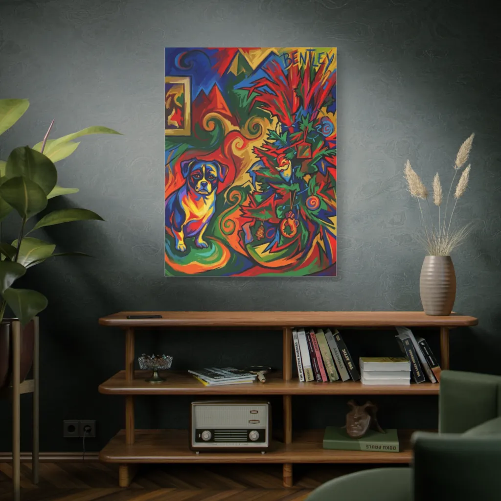 A vibrant, expressionistic holiday scene features a festive dog beside a wildly colorful Christmas tree, exuding spirited joy. Bentley, the spirited pup, is clearly the most vibrant gift under this dizzyingly festive tree.