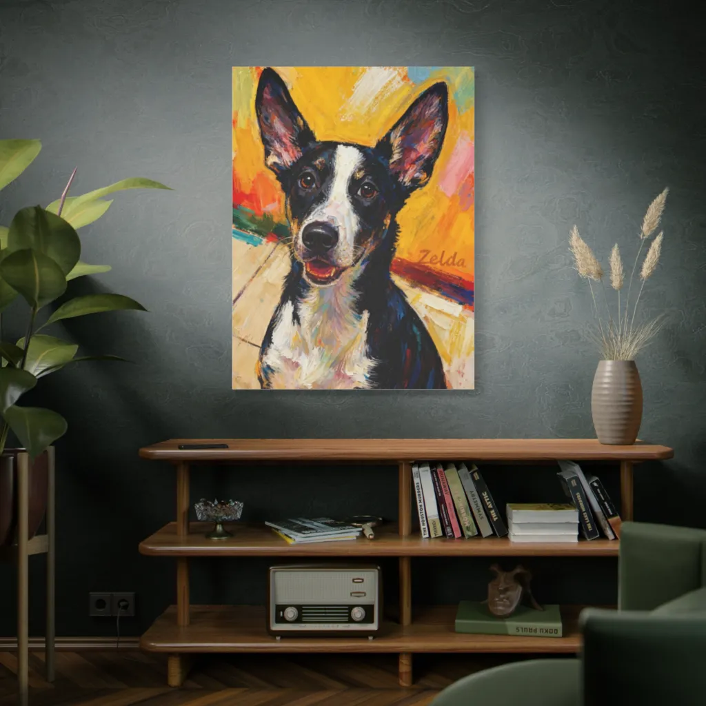 Zelda's alert ears and joyful gaze perfectly capture her eager spirit. This portrait beautifully reveals her readiness for adventure, brimming with unique, lovable character. A truly soulful depiction.