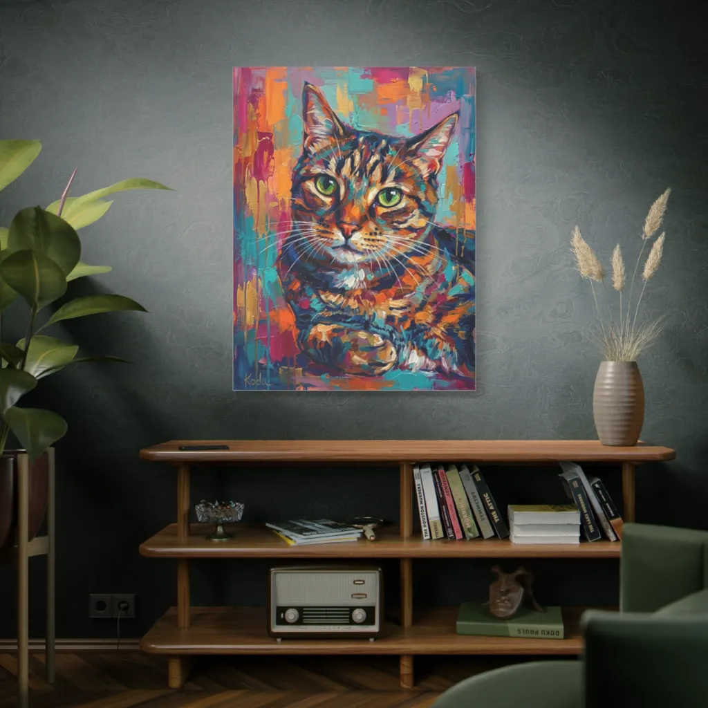 Vibrant impasto strokes craft a captivating tabby cat portrait, its intense green eyes brimming with playful, regal charm. This Gumbie Cat, having ditched her demure brown, now boasts a wildly expressive, rainbow coat and a truly *cat*ivating gaze.