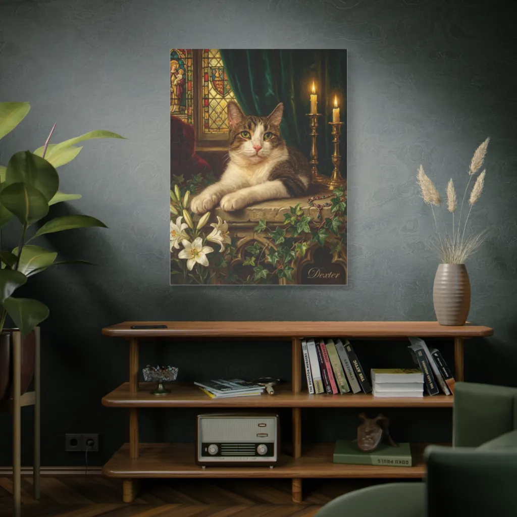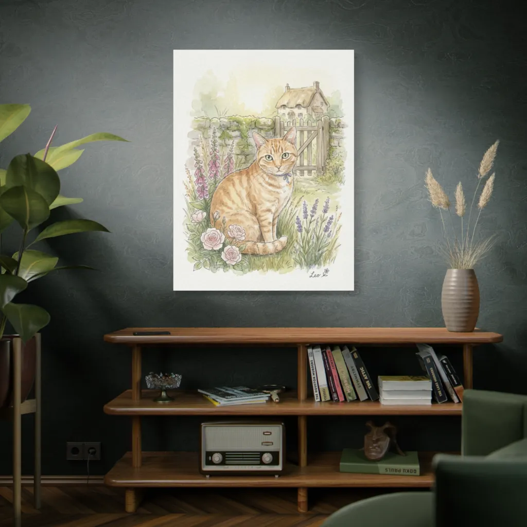 This charming watercolor captures a curious tabby and a cheeky robin under autumn foliage, evoking a warm, whimsical moment. Little Man, the tabby maestro, offers a masterclass in patient observation, his robin pal blissfully unaware.