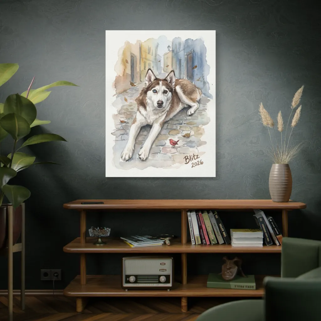 This charming watercolor depicts a soulful husky on an autumnal cobblestone street, evoking a tranquil and gently whimsical mood. Looks like Blitz 2026 is already perfecting his soulful stare for future fans, right here on this charming old path.