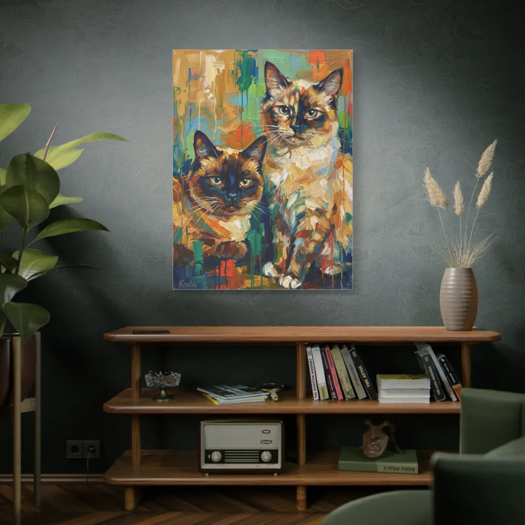 Bold, expressive brushstrokes paint a vibrant, rainbow-striped cat with an alert gaze, creating a brilliantly lively and captivating mood. If Rip Van Winkle slept through this cat's colorful awakening, he truly missed a vibrant, purr-fect masterpiece!